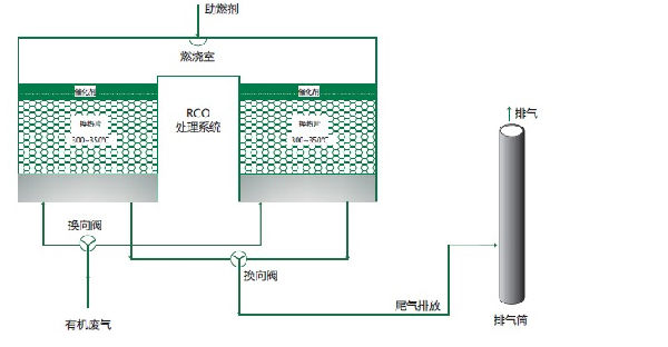 有機廢氣經(jīng)過催化燃燒的反應產(chǎn)物一般是CO2和H2O,此類成分在催化劑吸附載體內吸附容量小,易于脫附。脫附后,催化劑載體重新恢復吸附性能。在反應過程中,吸附-催化燃燒-脫附持續(xù)進行,實現(xiàn)廢氣的凈化和排放。一般反應尾氣有較高的溫度,會通過換熱器或熱空氣循環(huán)裝置將熱量用于預熱進氣、或維持反應艙室的溫度。
