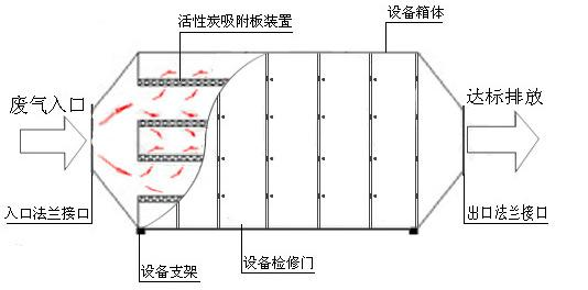 廢氣經過吸附塔內的初效過濾器除去固體顆粒物后,進入塔體,經過活性炭層吸附后,除去氣體中的有機廢氣分子,達到符合排放標準的凈化氣體,經風機排到室外。