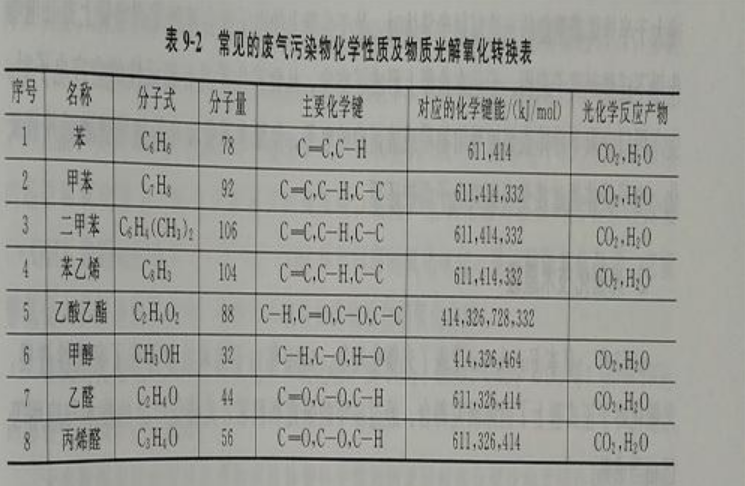 1、光解技術的原理光解是利用UV紫外光的能量使空氣中的分子變成游離氧,游離氧再與氧分子結合,生成氧化能力更強的臭氧。近而破壞VOCs中的有機或無機高分子化合物分子鏈,使之變成低分子化合物,如CO、HO等。由于UV紫外光的能量遠遠高于一般有機化合物的結合能,因此,采用紫外光照射有機物,可以將它們降解為小分子物質。
