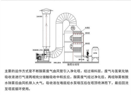排除的酸霧廢氣→進(jìn)入風(fēng)管→經(jīng)過酸堿廢氣處理塔→風(fēng)機→風(fēng)管→達(dá)標(biāo)排放。